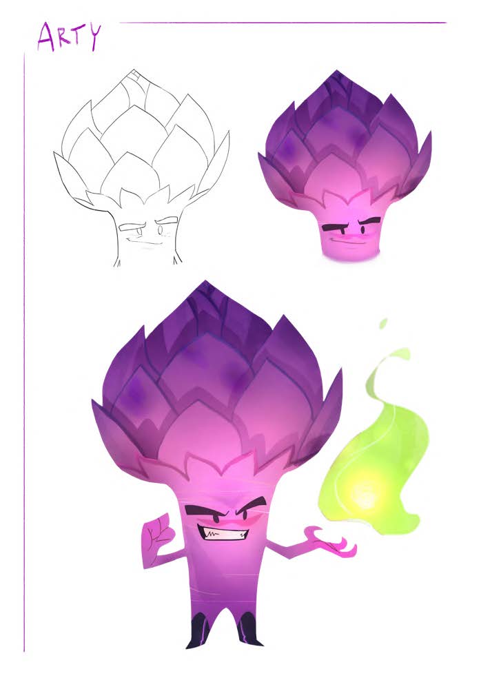 PERSONALITY: Small, evil demon in the form of an artichoke. He is one of the many enemies that the players come across at the start of the game and whom they continually defeat. His inoffensive features and nickname only increase the frustration and dissatisfaction caused by his insignificant role in the game. For this reason, Arty makes the decision to crash the entire system, in a suicidal gesture dictated by his inability to feel perfectly integrated into the world in which he lives.